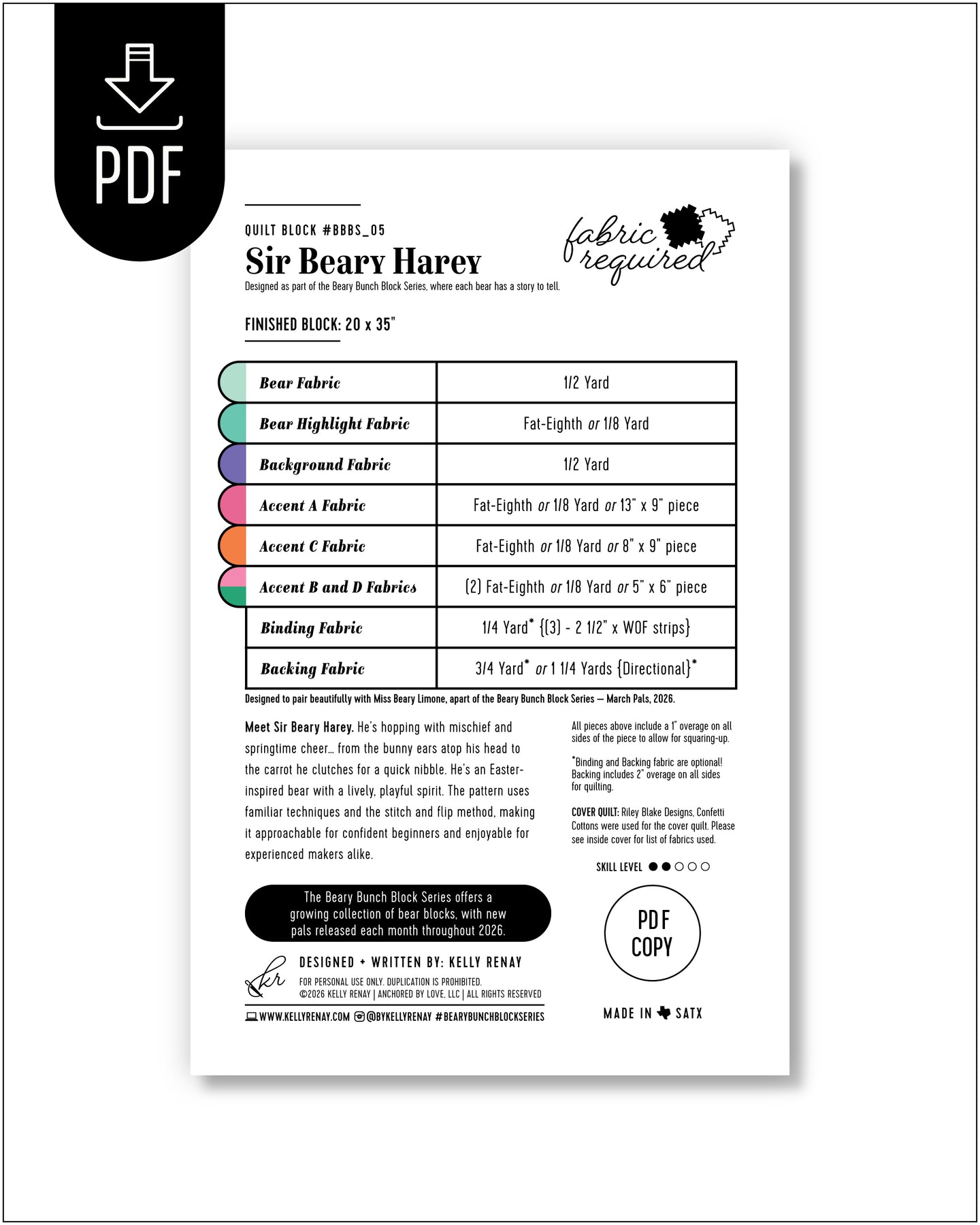 The Sir Beary Harey Quilt Block pattern is 10 pages, featuring detailed descriptive instructions that include colorfully illustrated diagrams.